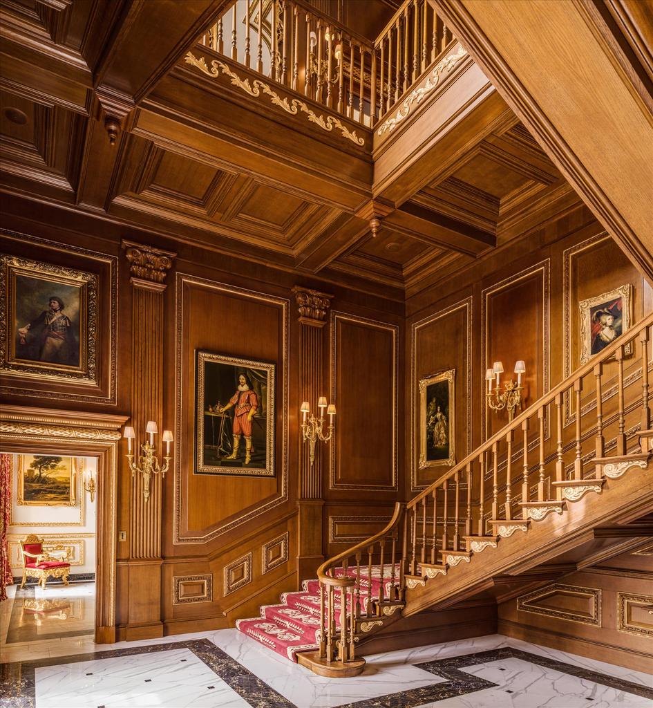 The grand 28,525 sq. ft. manor house, built in classic William and Mary architectural style, boasts state room-style principal entertaining spaces and a Grade II Listed coach house alongside estate cottages and substantial garaging for vehicles. The restoration was led by acclaimed designer Alexander Kravetz in collaboration with English Heritage and The Georgian Group to ensure historical accuracy.